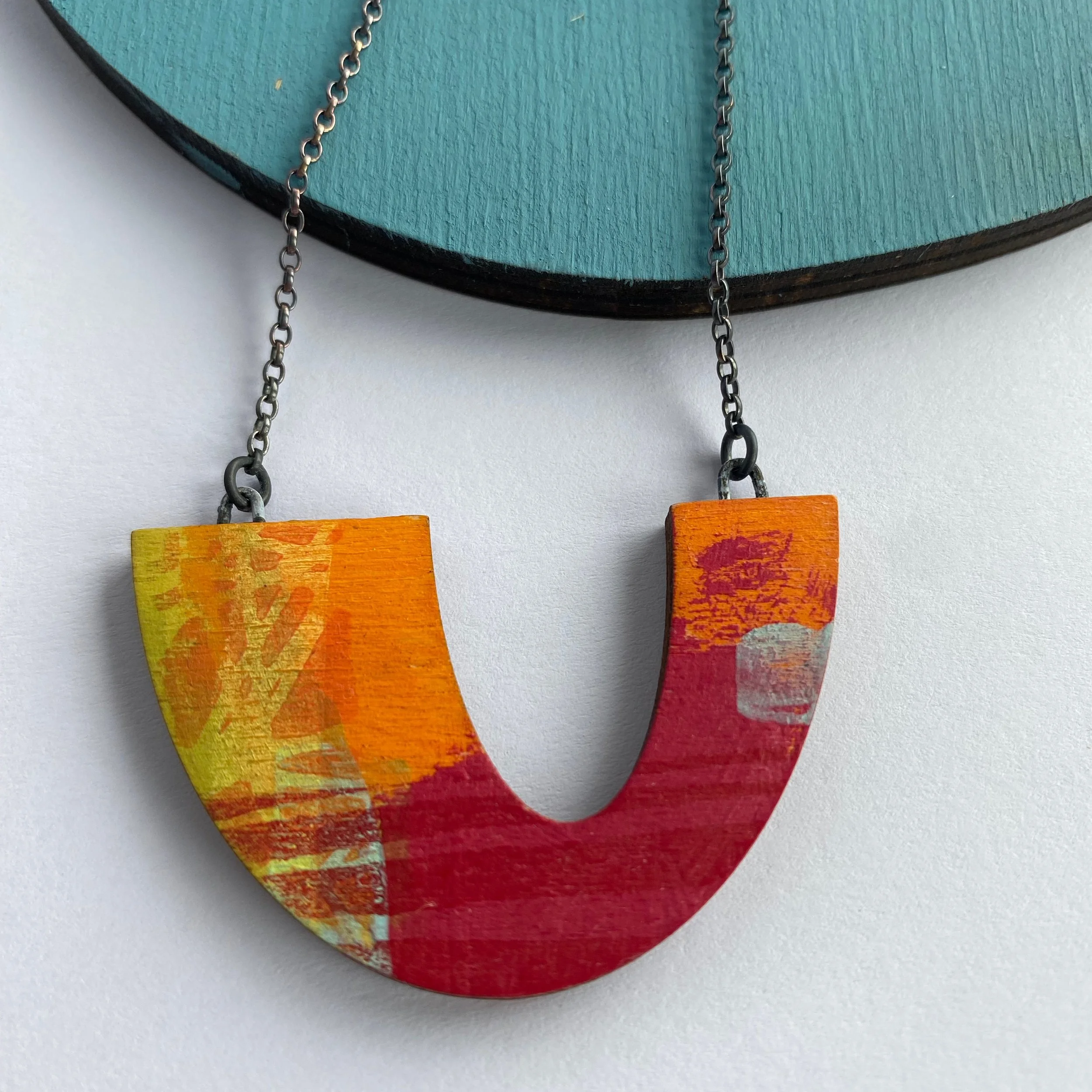 Reversible pendant hand painted and printed in different patterns in multi colours on sustainable birch plywood. This one off piece predominantly painted and printed in red/pink on one side and orange/red/pink pattern on reverse, to ring the changes.